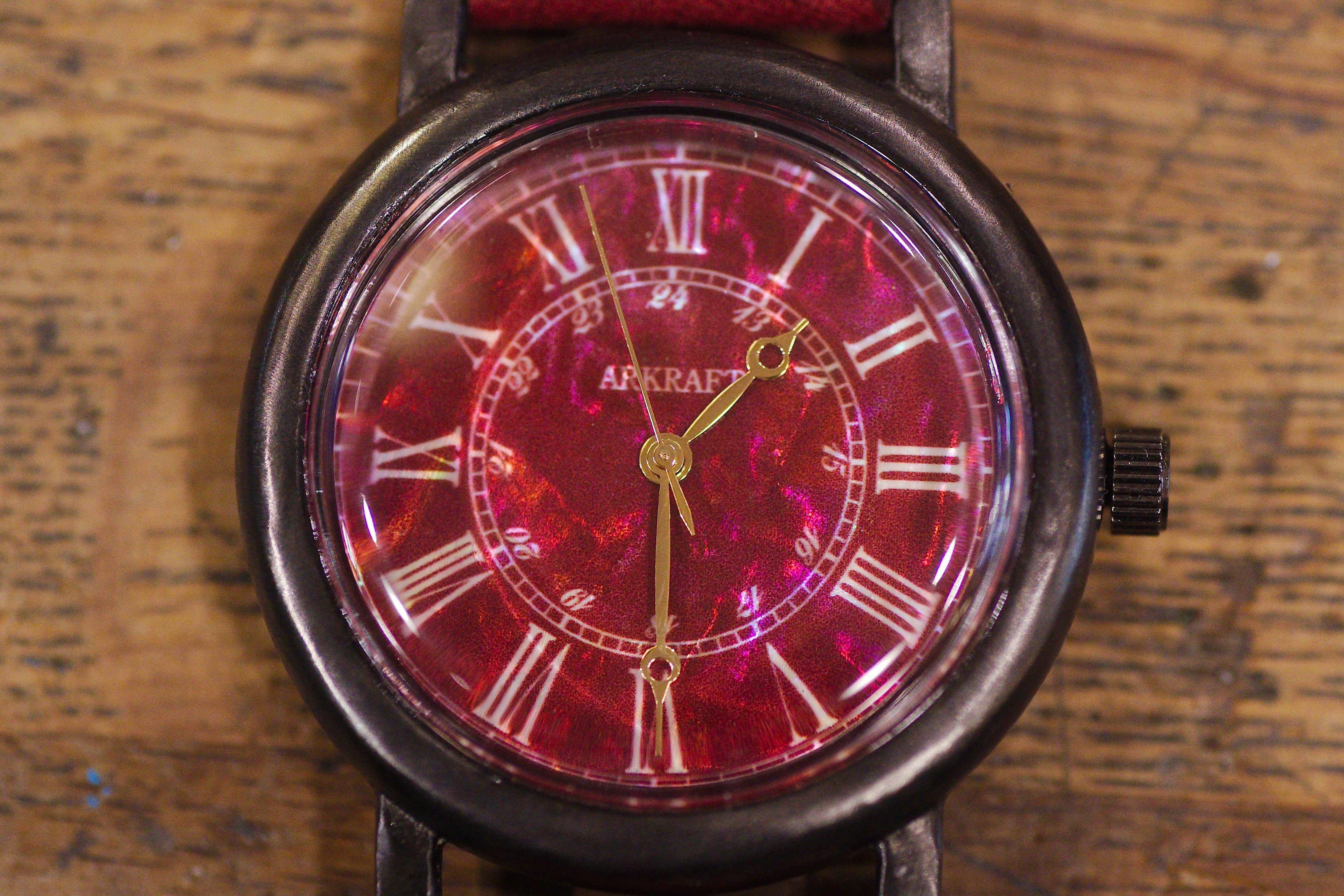 文字盤にアワビ貝を使用し、そこに深いワイン色とクラシカルなローマ数字を入れました。