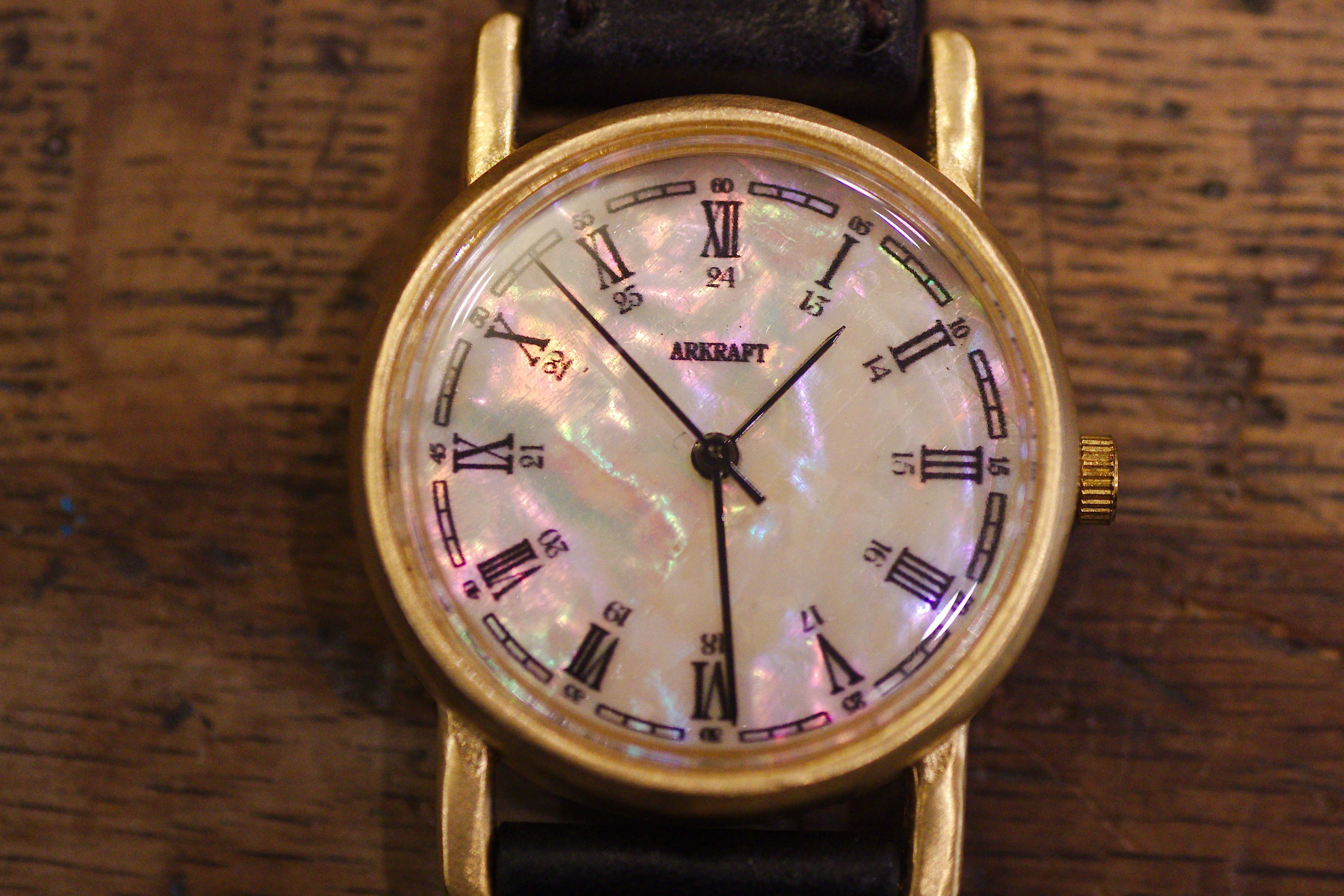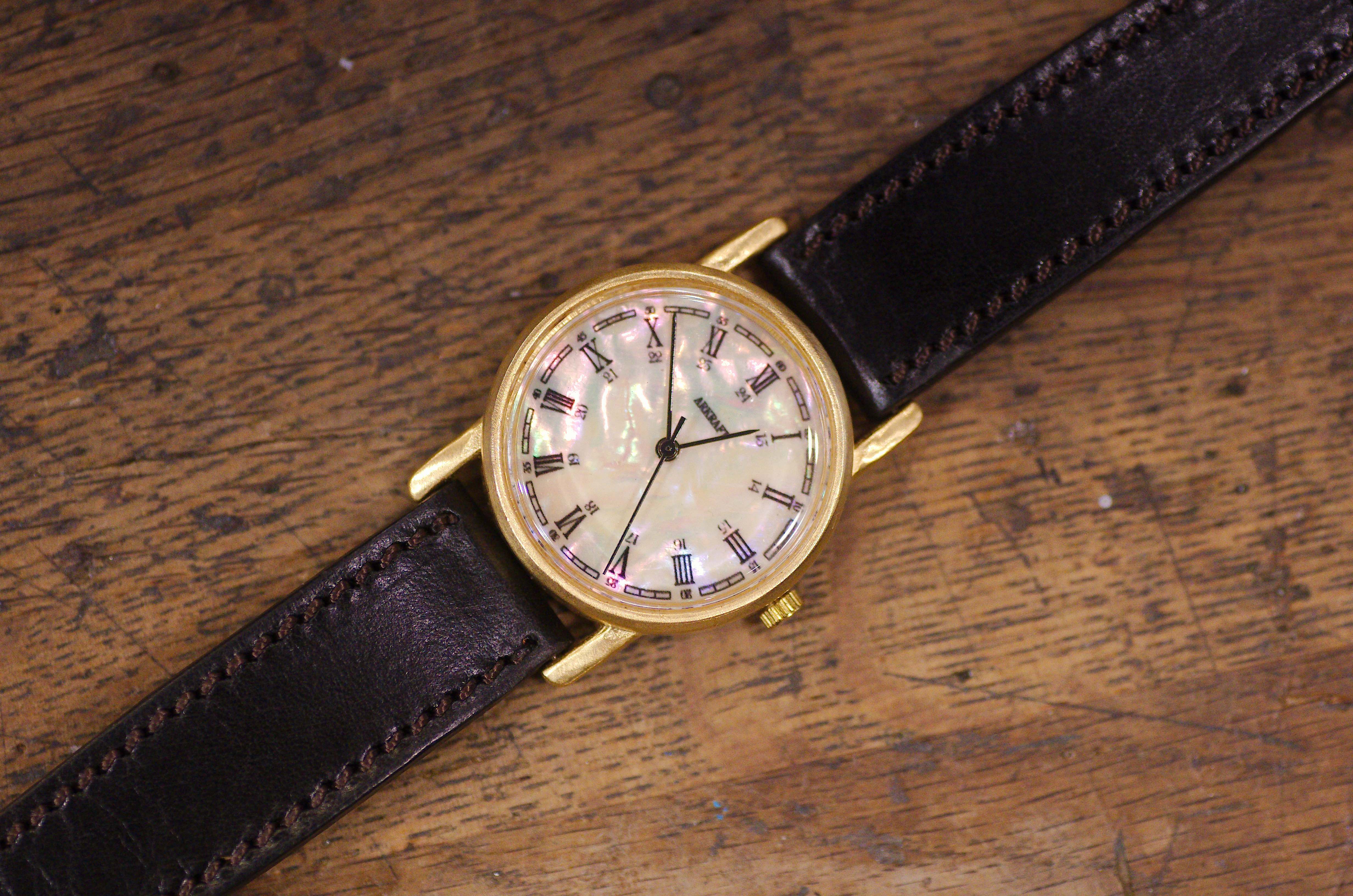 18Kコーティングしたゴールド色のシンプルな時計ケースにアワビ貝をベースにした七色の光沢のあるローマ数字文字盤を合わせたクラシカルさとモダンさを併せ持つ腕時計です。