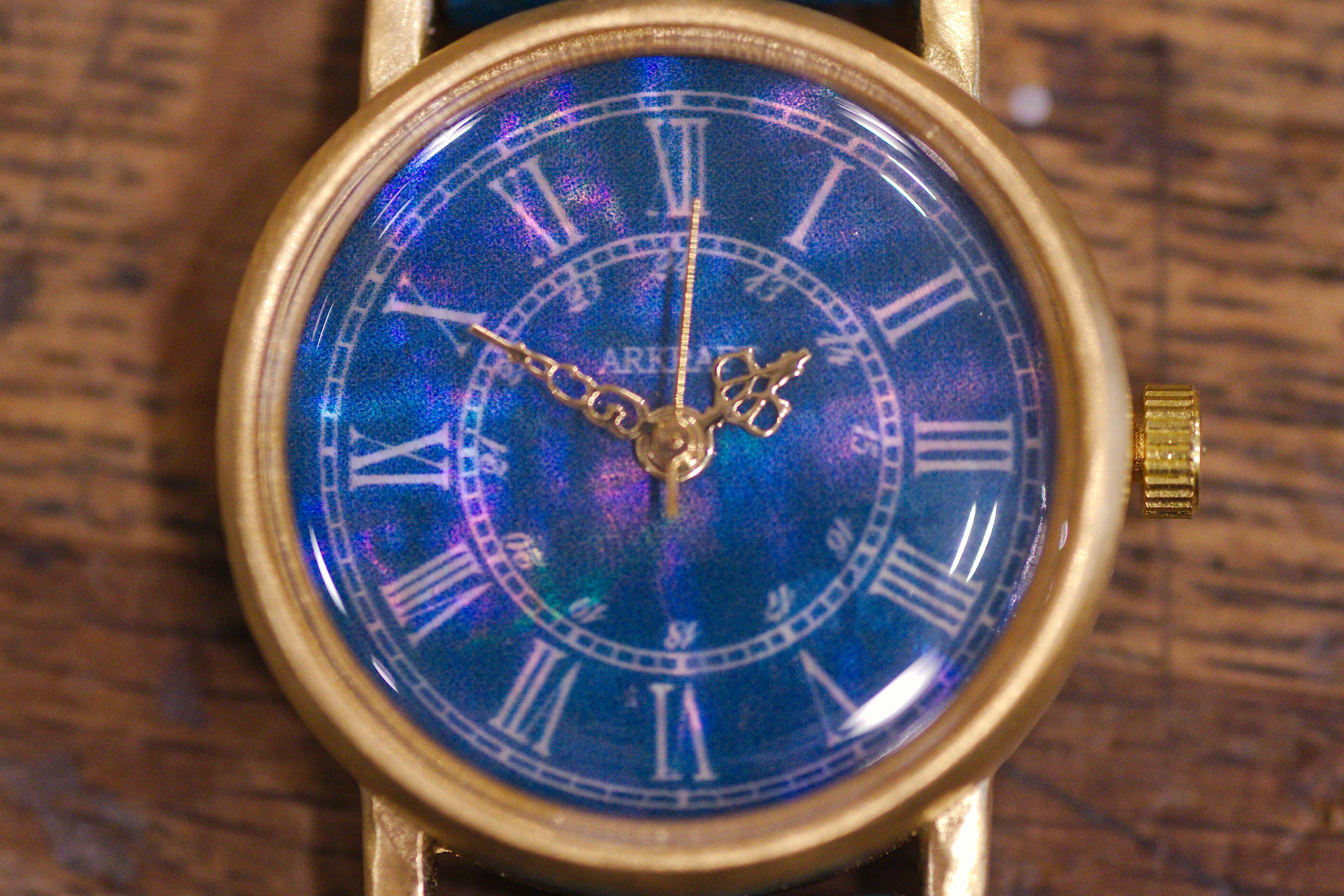 18Kコーティングしたゴールド色のシンプルな時計ケースにスカイブルーをベースにしたローマ数字とアワビ貝の文字盤を合わせたクラシカルさとモダンさを併せ持つ腕時計です。