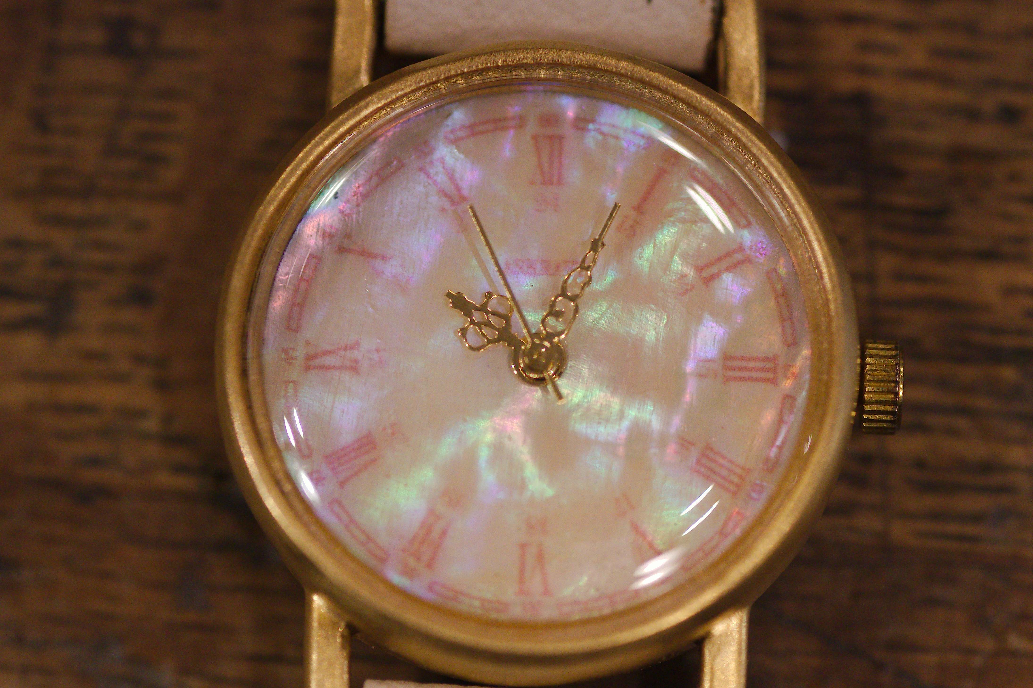 18Kコーティングしたゴールド色のシンプルな時計ケースにアワビ貝をベースにした七色の光沢のある桜色のローマ数字文字盤を合わせたクラシカルさとモダンさを併せ持つ腕時計です。