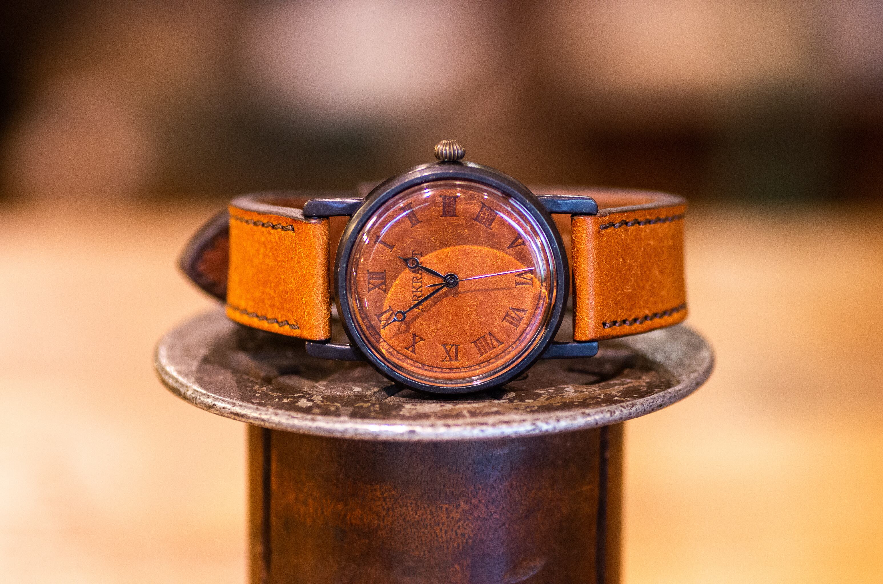 ベルトにも文字盤と同じ革を使用しているため文字盤には製作時の革の色が残り、ベルトは使用するにつれて色合いが深みを増していくのでその過程を常に楽しめるのも特徴です。