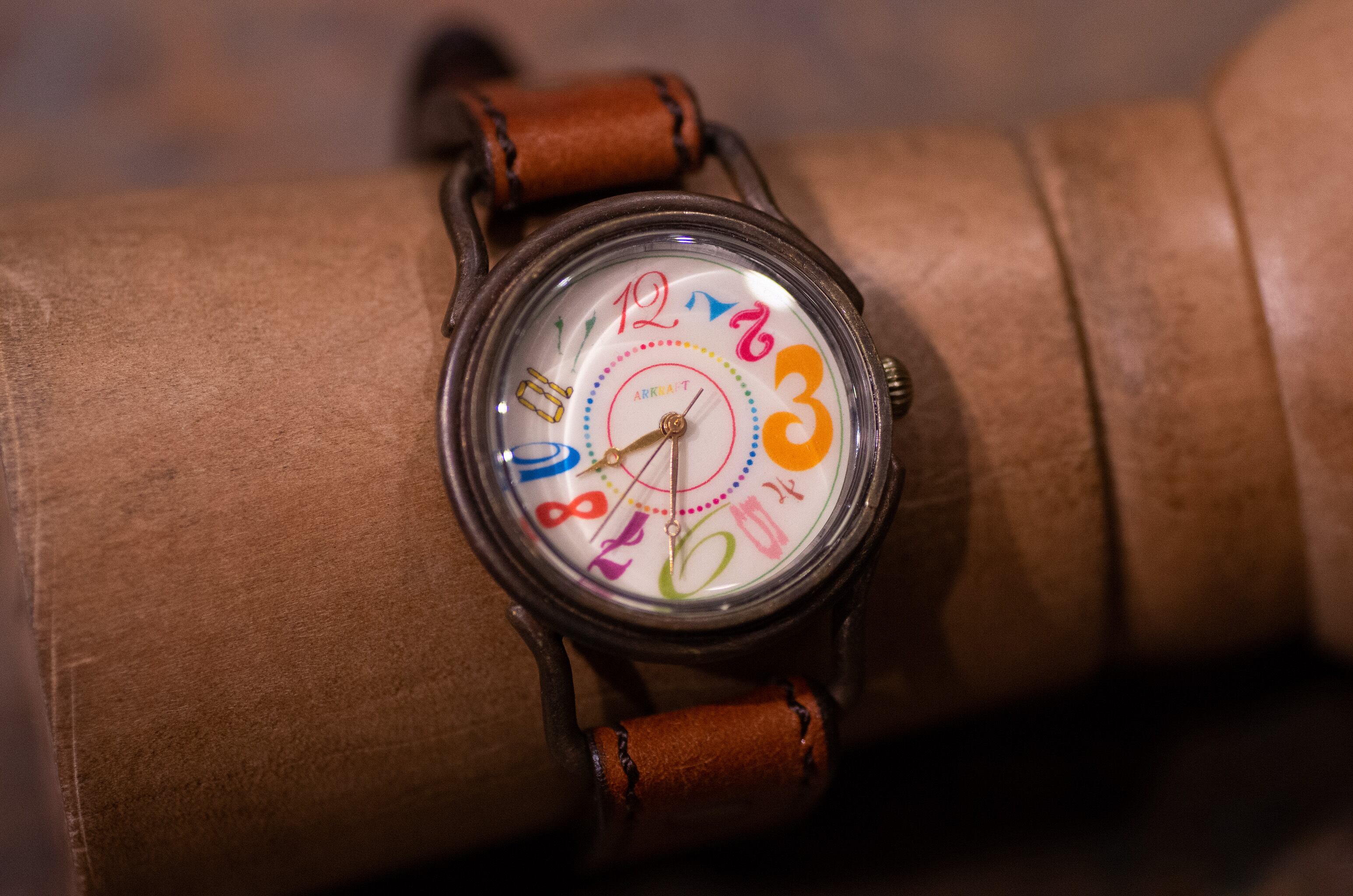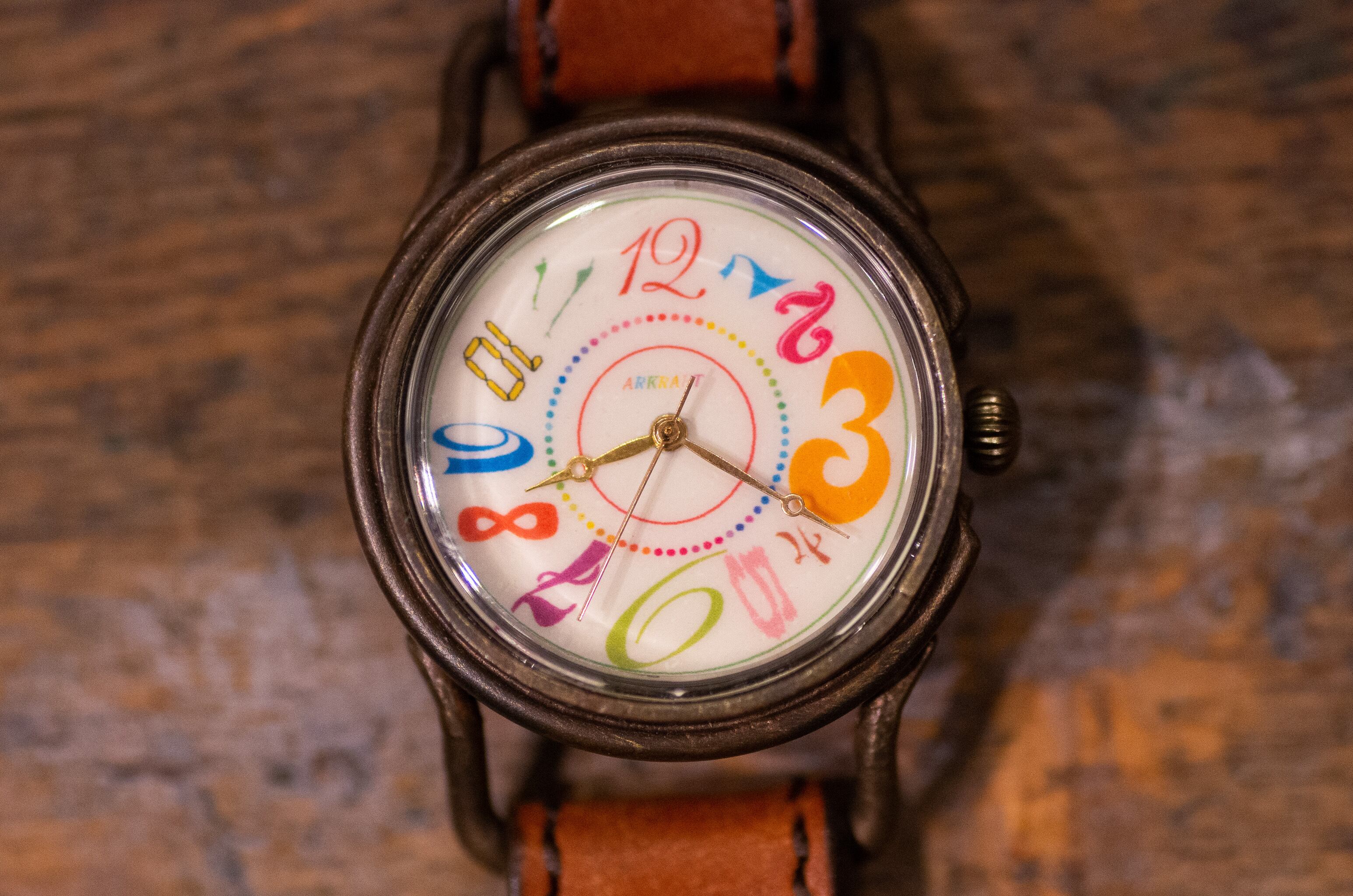 文字盤に角度、字体、文字サイズ、色のすべてをバラバラにした数字を使った個性的な作品です。