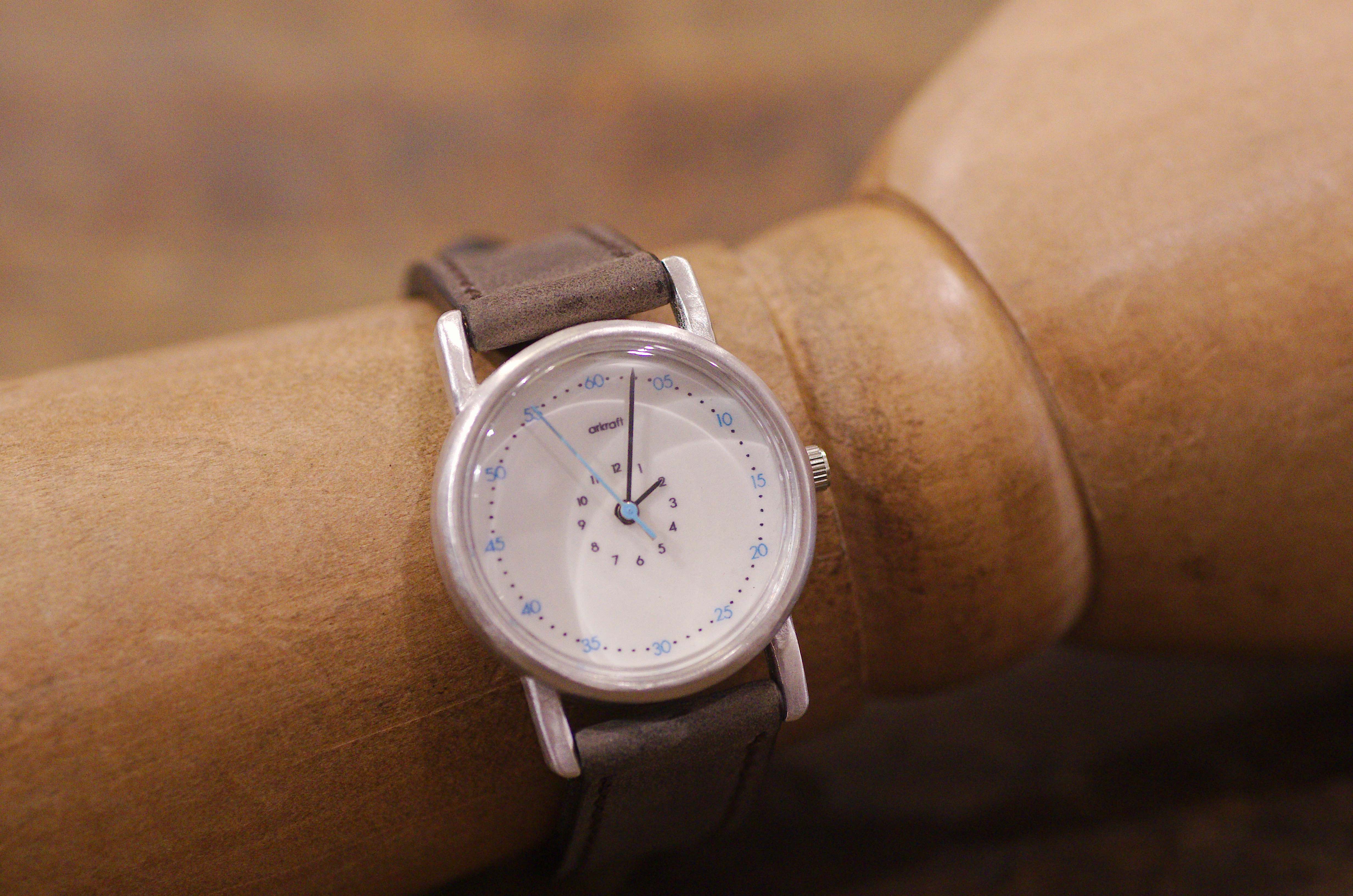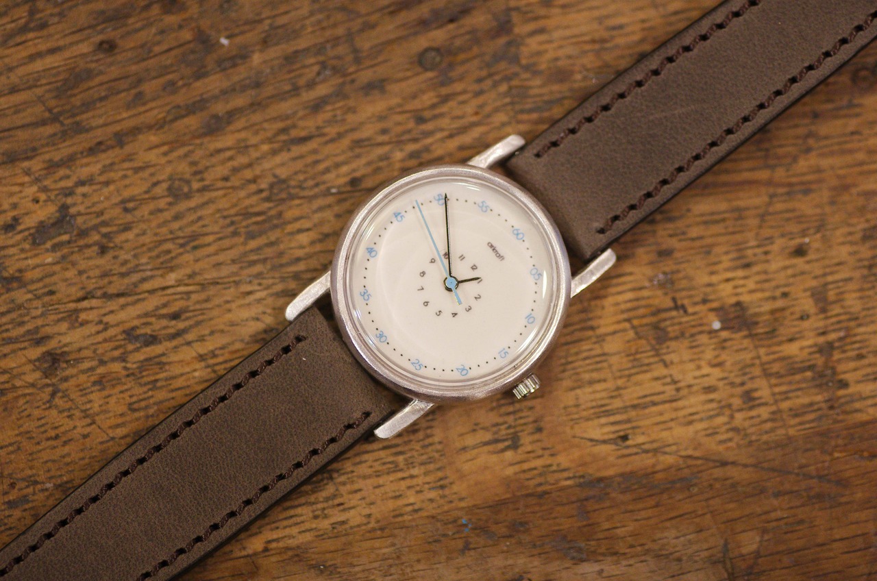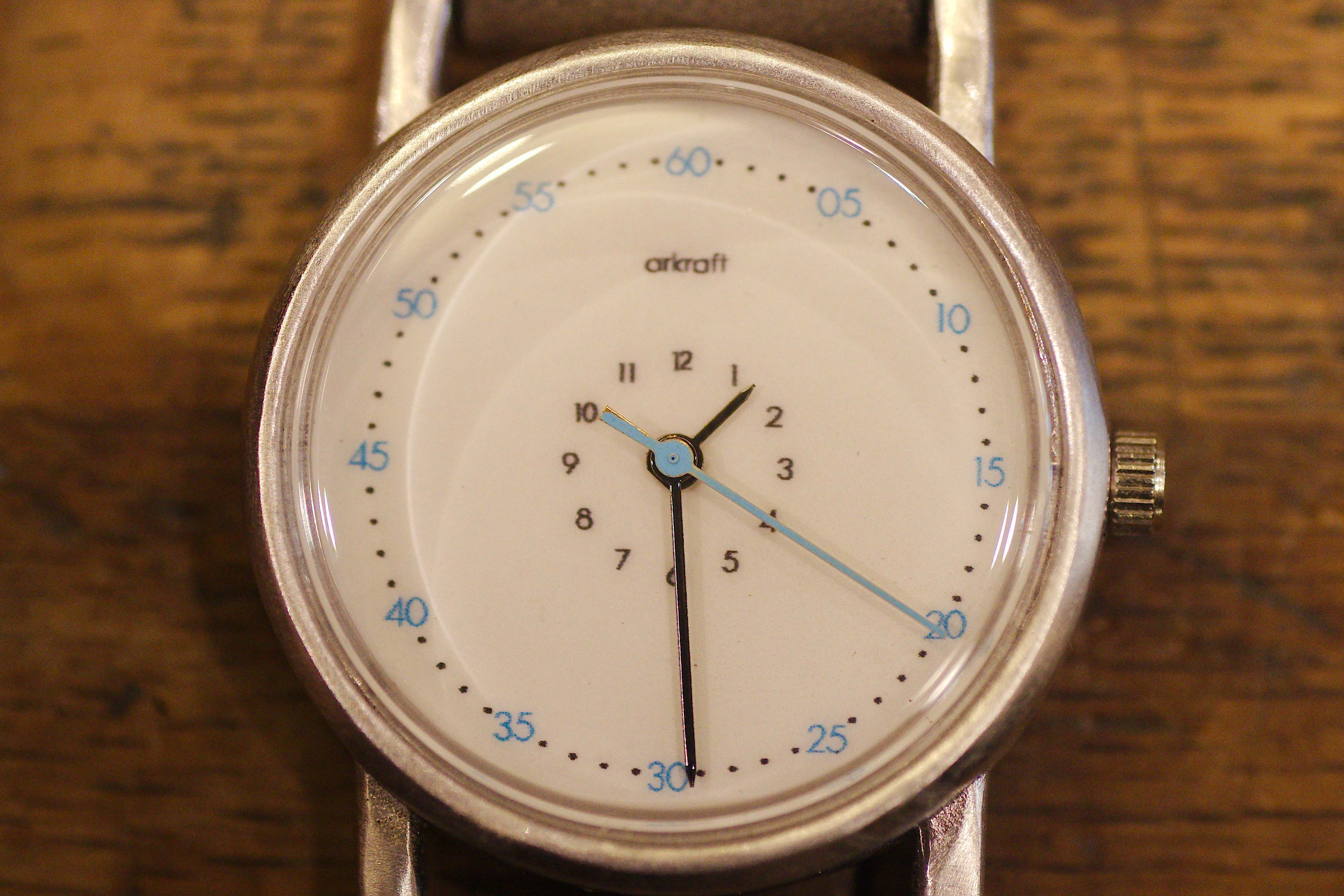 文字盤に短めの時針と長めの分針・秒針をつかいそれぞれに合わせたインデックスを入れることにより、時間表記と分表記のアンバランスで個性的なデザイン性と時間の見やすさを共存させた作品です。