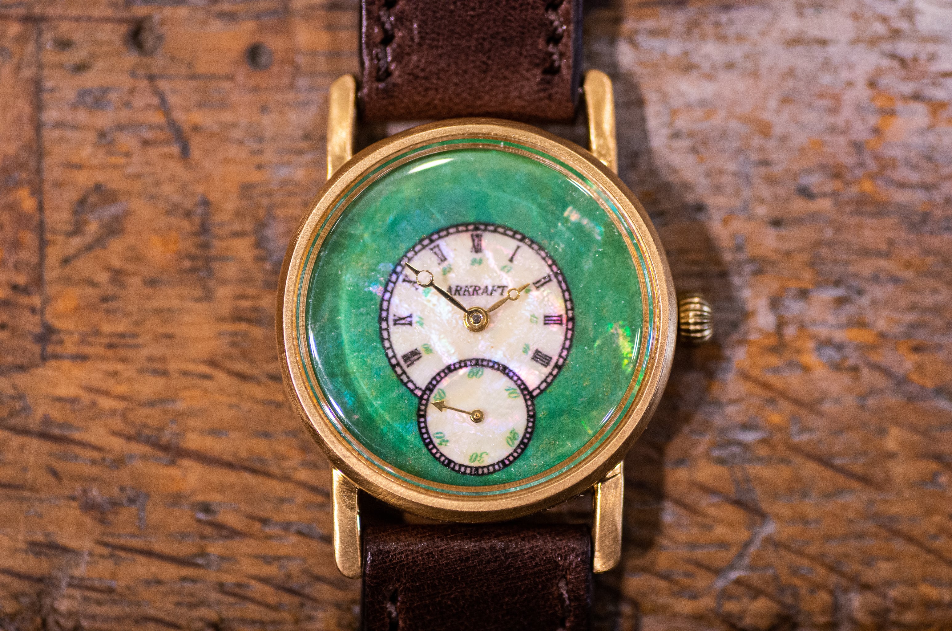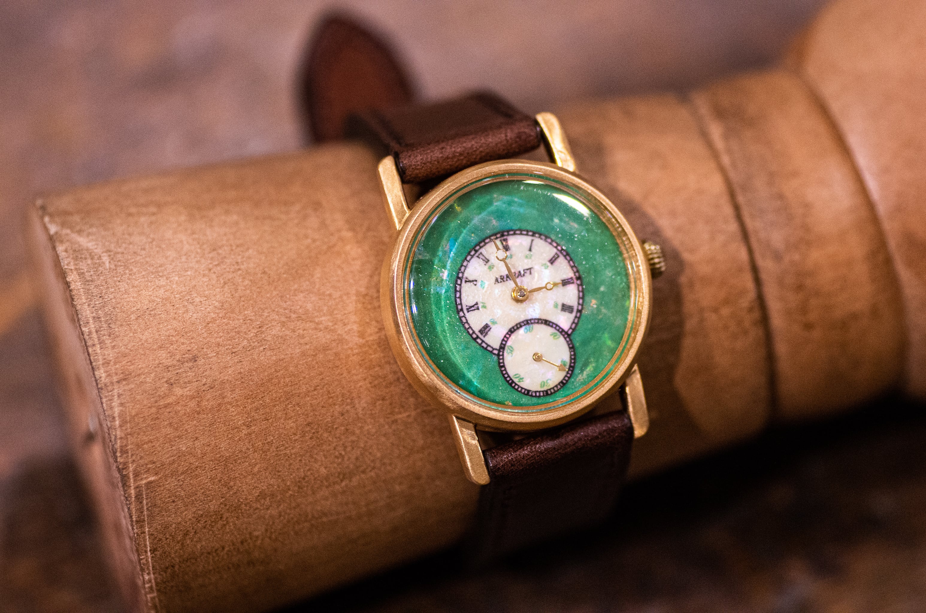 文字盤の素材に七色に反射する煌びやかな青貝を使用してインデックスの外側には力強い緑色を入れました。