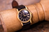 18Kコーティングしたゴールド色のシンプルな時計ケースに黒をベースにした光沢のあるローマ数字の文字盤を合わせたクラシカルさとモダンさを併せ持つ腕時計です。