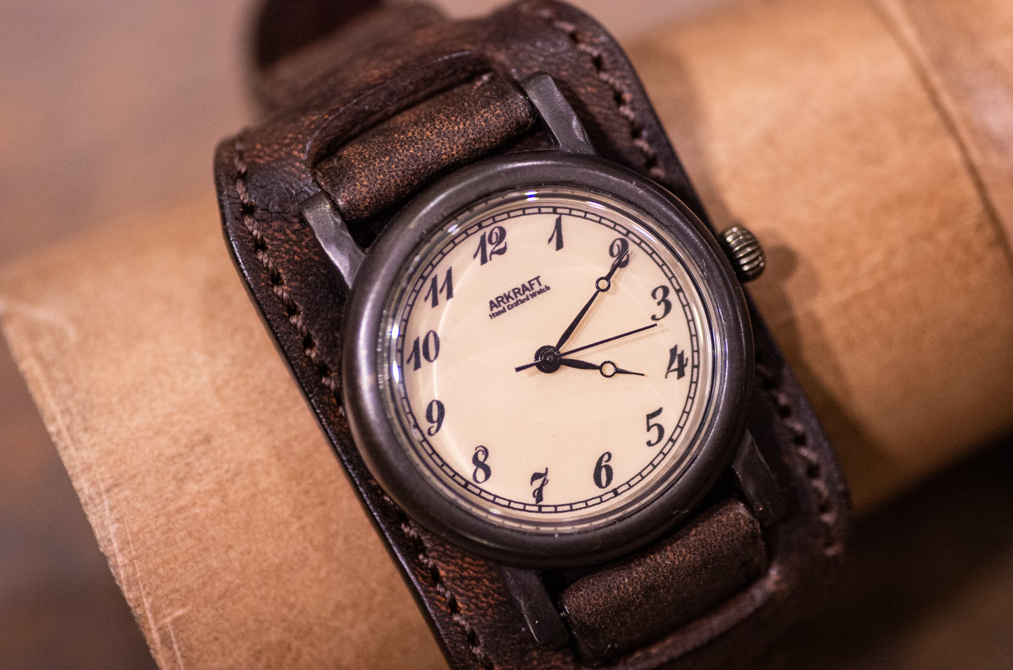 この作品は時計が直接肌に触れないカフストラップを付けていてミリタリーウォッチのような存在感のある時計です。