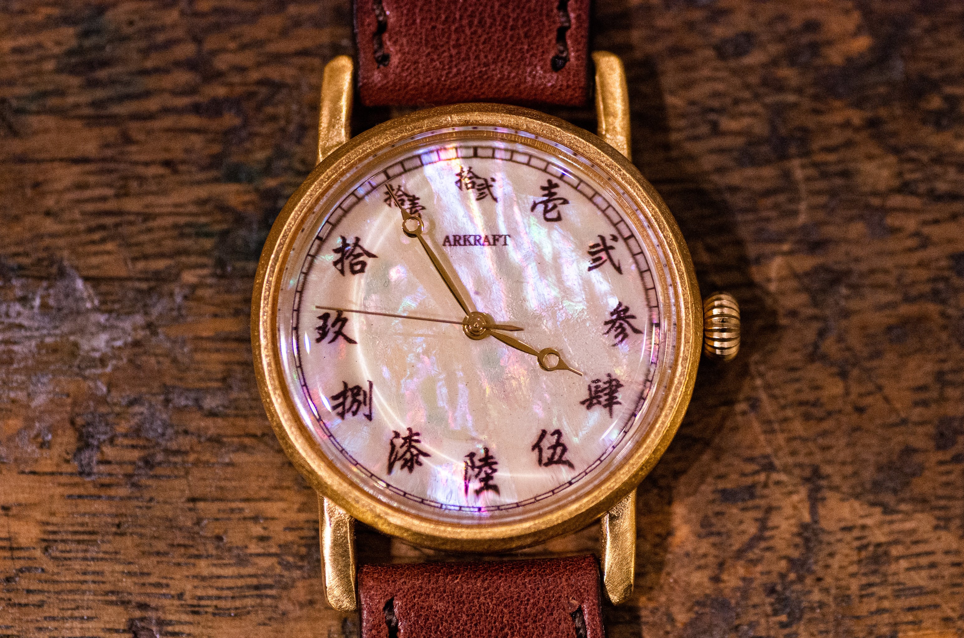文字盤に虹色に反射する青貝(アワビ貝)を使用し、そこに漢数字の大字を入れました。