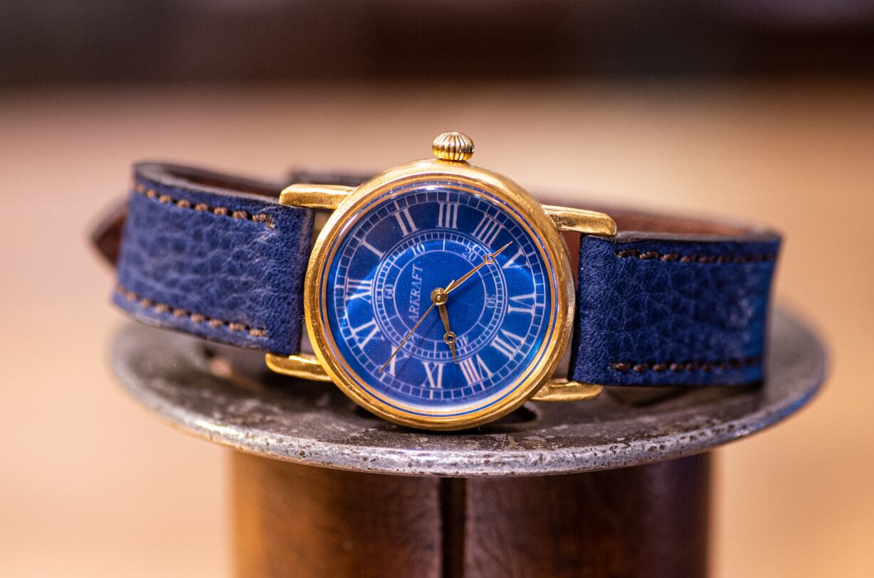 18Kコーティングしたゴールド色のシンプルな時計ケースに青をベースにしたローマ数字とアワビ貝の文字盤を合わせたクラシカルさとモダンさを併せ持つ腕時計です。