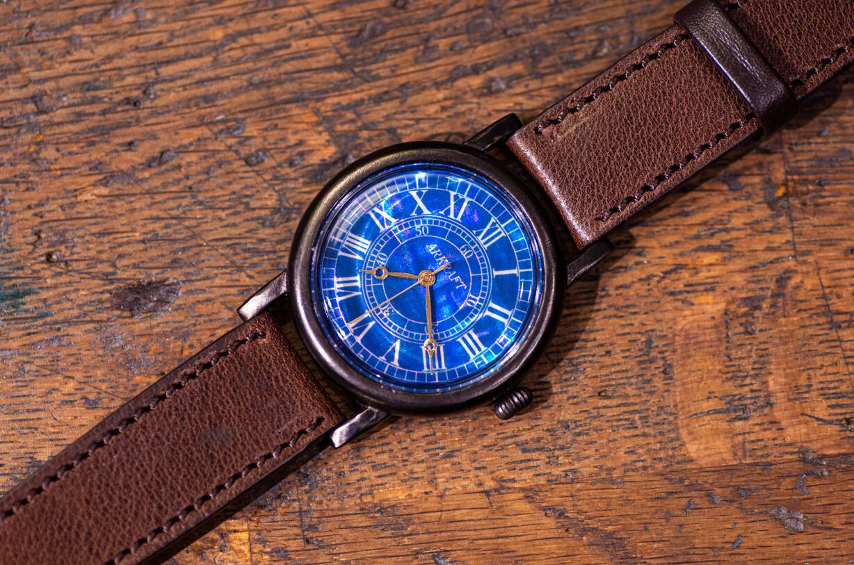 文字盤にアワビ貝を使用し、上に深い青色とクラシカルなローマ数字を入れました。