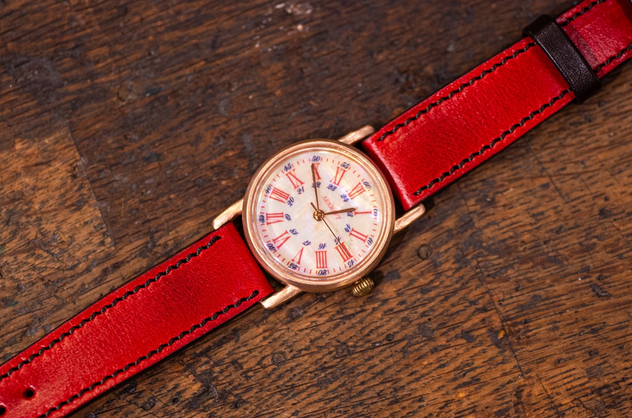 この作品はローズゴールドの時計ケースとアワビ貝を下地に使用し赤のローマ数字と青のアラビア数字を組み合わせました。