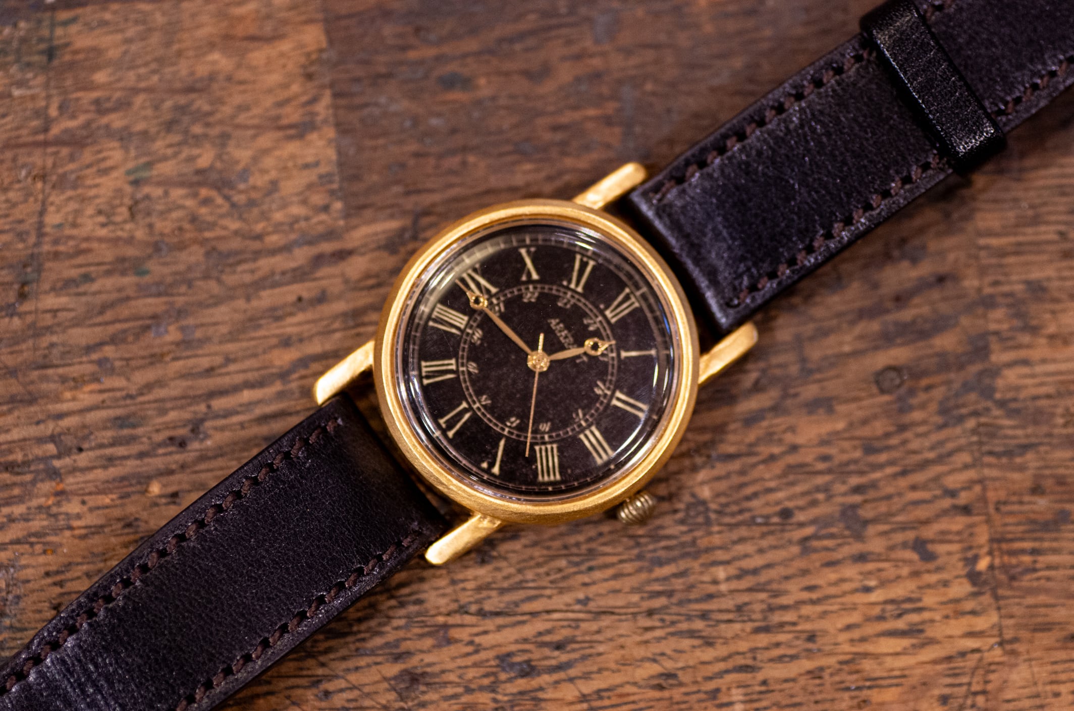 18Kコーティングしたゴールド色のシンプルな時計ケースに黒をベースにした光沢のあるローマ数字の文字盤を合わせたクラシカルさとモダンさを併せ持つ腕時計です。
