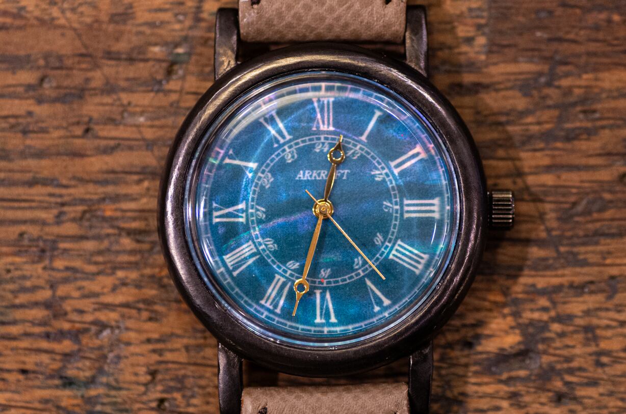 文字盤にアワビ貝を使用し、上に深い緑よりの青とクラシカルなローマ数字を入れました。