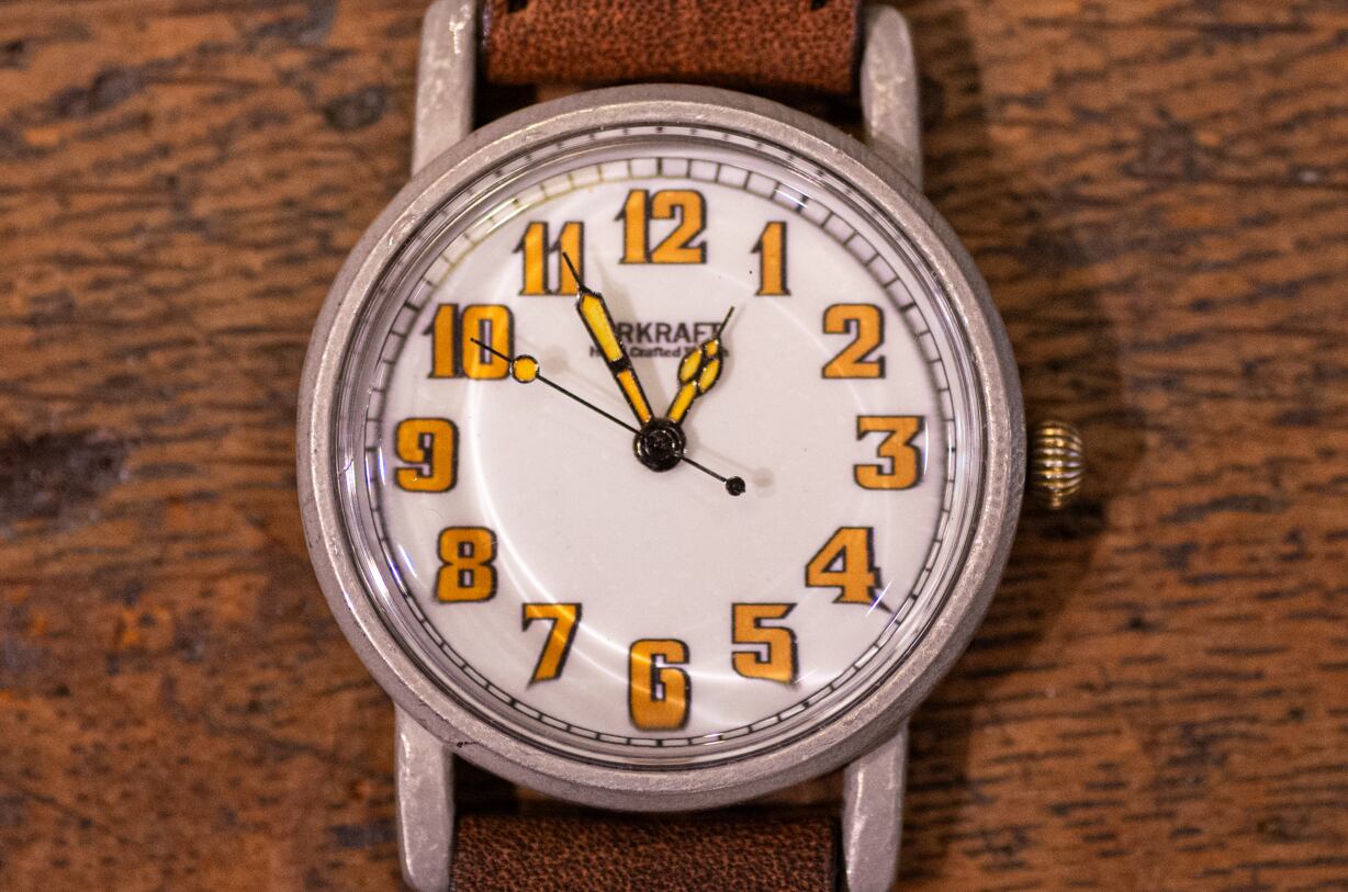 真鍮無垢素材にに鈍いシルバー色のヴィンテージ感のある錫メッキを施した時計ケースとレトロ感のある黄いろのアラビア数字の文字盤を組み合わせました
