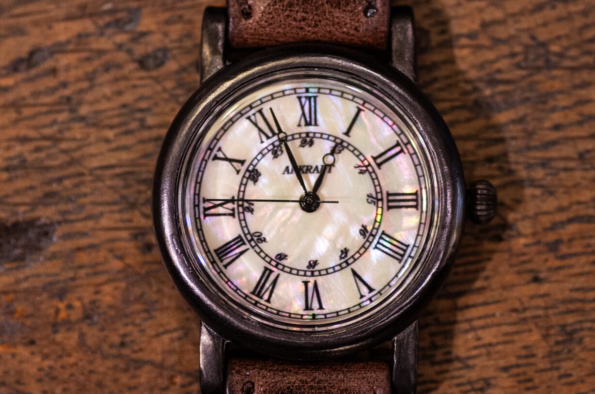 文字盤にアワビ貝を使用しクラシカルなローマ数字を入れました。