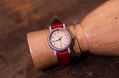 This is a watch with a retro and pop red Arabic index dial.