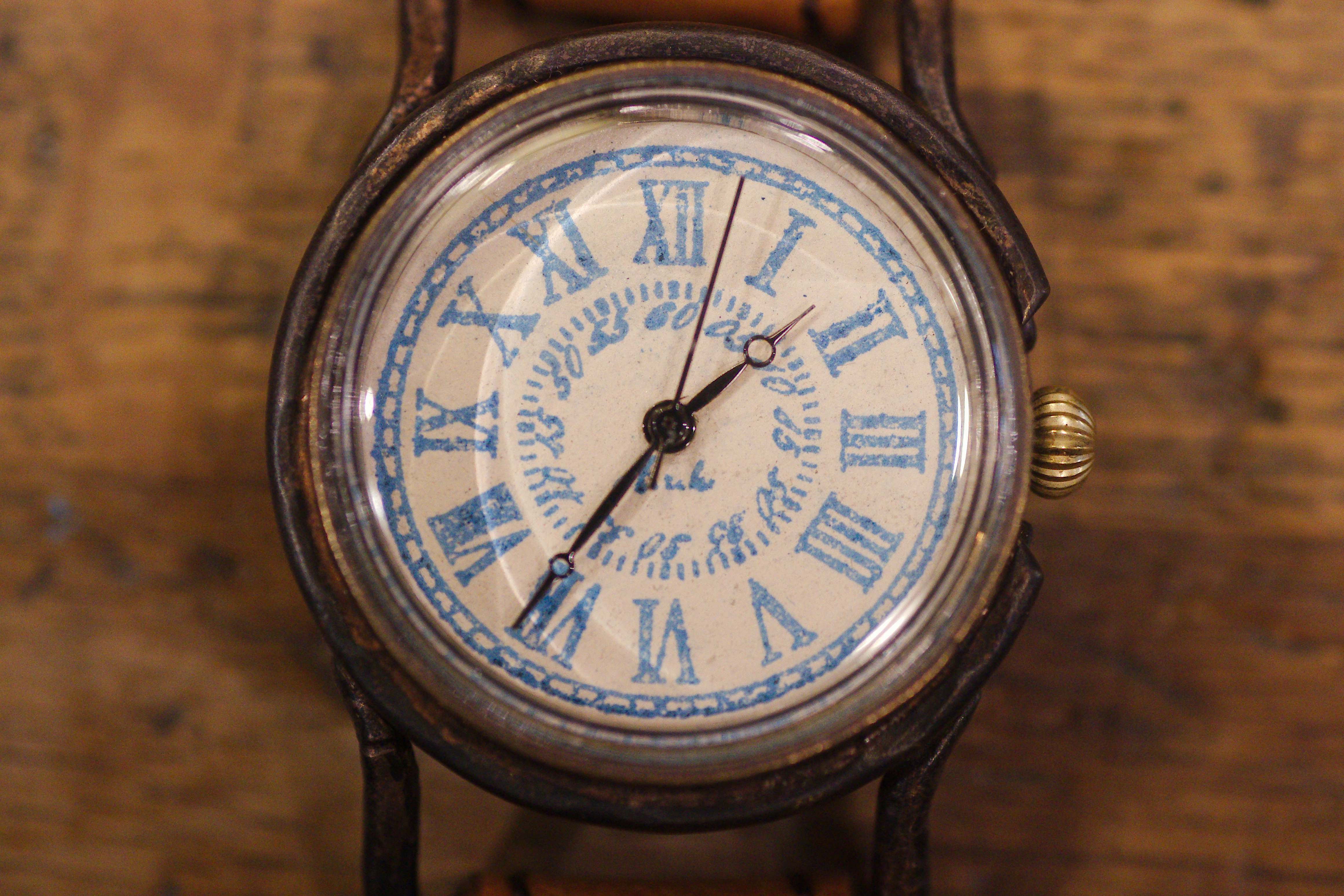 ケースは文字盤の雰囲気に合わせ、金槌で叩き跡をつけたリングが印象的などこか温かみのある雰囲気を持つ作品です。
