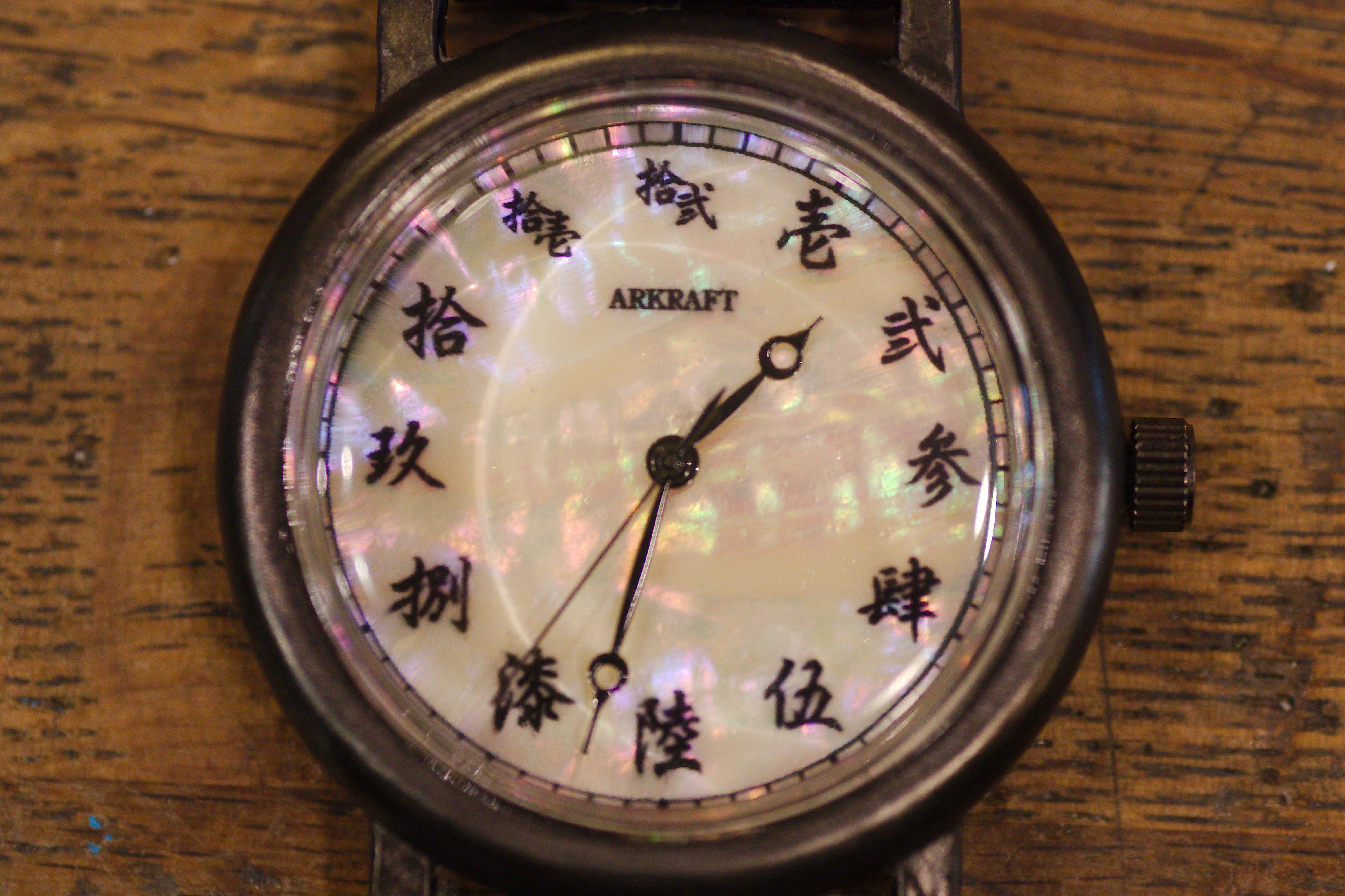 文字盤に虹色に反射する青貝(アワビ貝)を使用し、そこに漢数字の大字を入れました。