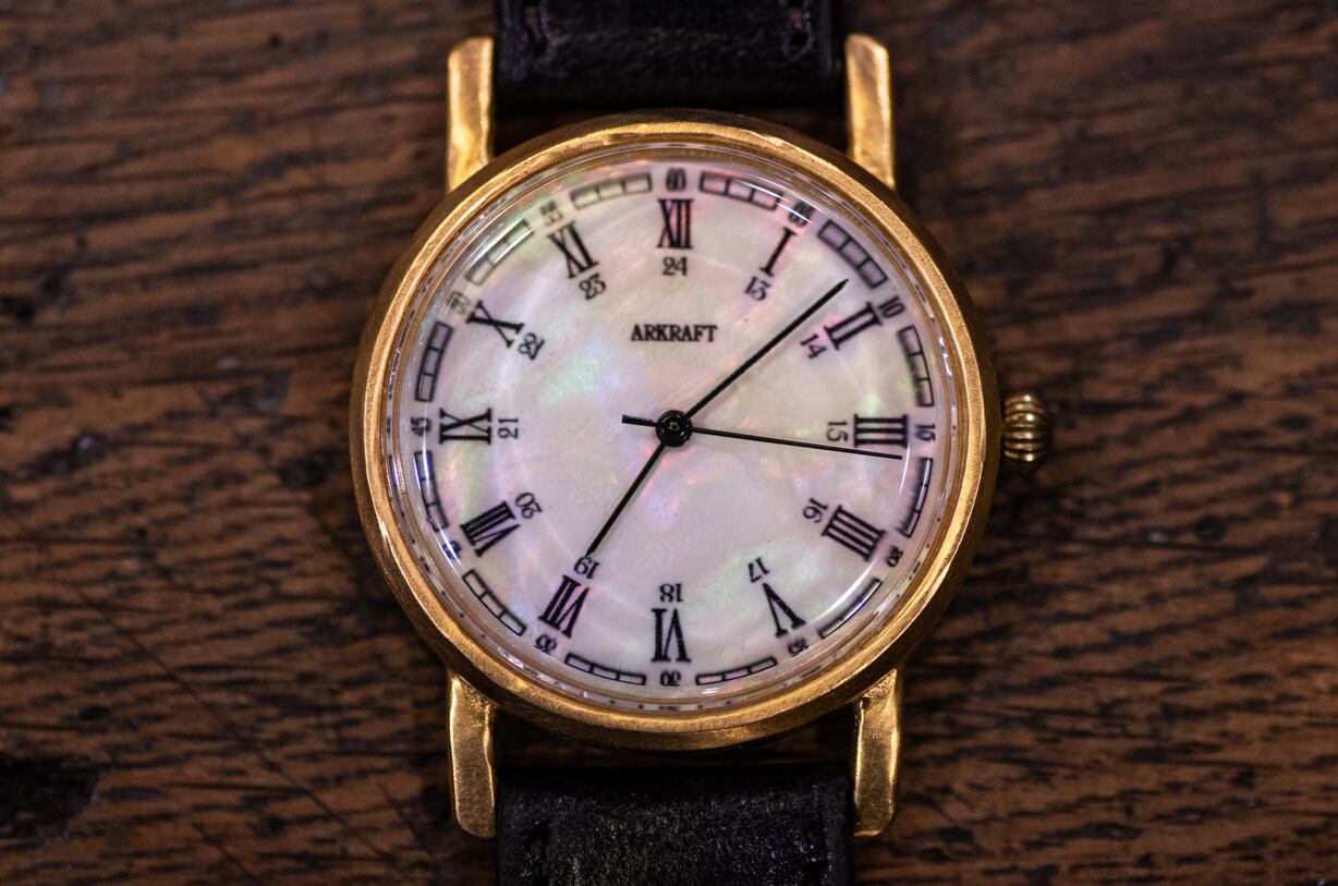 18Kコーティングしたゴールド色のシンプルな時計ケースにアワビ貝をベースにした七色の光沢のあるローマ数字文字盤を合わせたクラシカルさとモダンさを併せ持つ腕時計です。