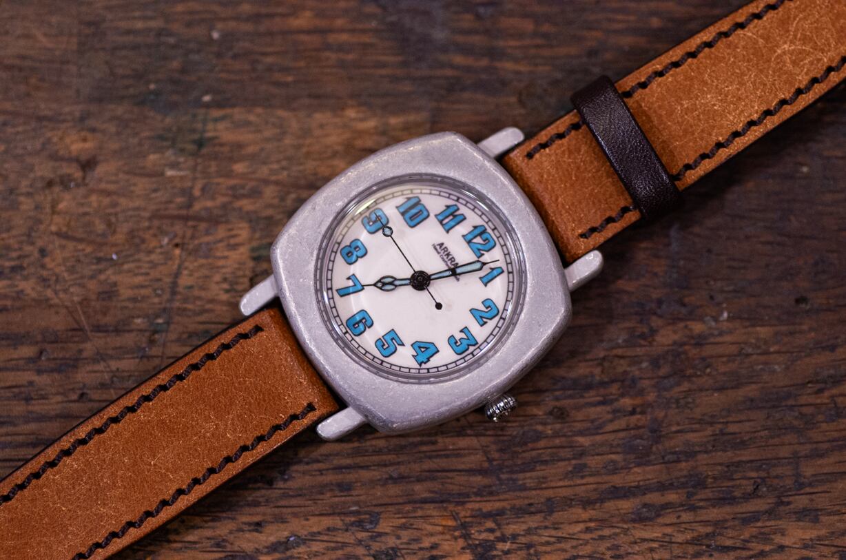 真鍮無垢素材にに鈍いシルバー色のヴィンテージ感のある錫メッキを施したクッション型時計ケースとレトロ感とポップさのある水色のアラビア数字文字盤を組み合わせました。。